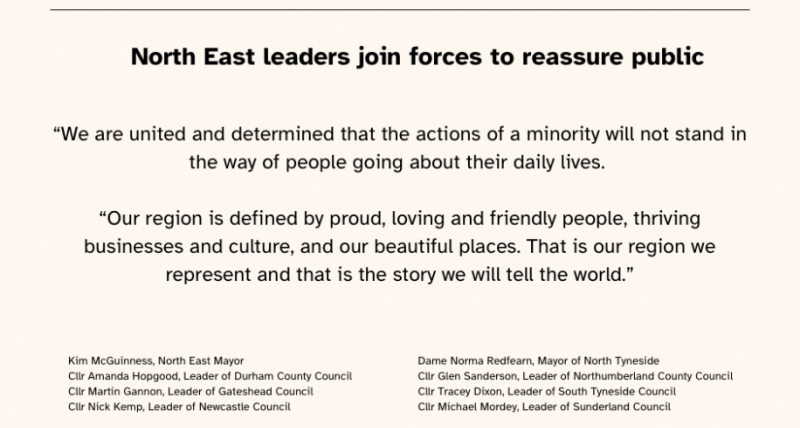 The leaders of the region’s seven local authorities of Durham, Gateshead, Newcastle, North Tyneside, Northumberland, South Tyneside and Sunderland, have joined North East Mayor Kim McGuinness in issuing a joint statement to reassure the public that plans are in place to keep communities safe, and that the North East remains open for business ahead of planned demonstrations at the weekend.